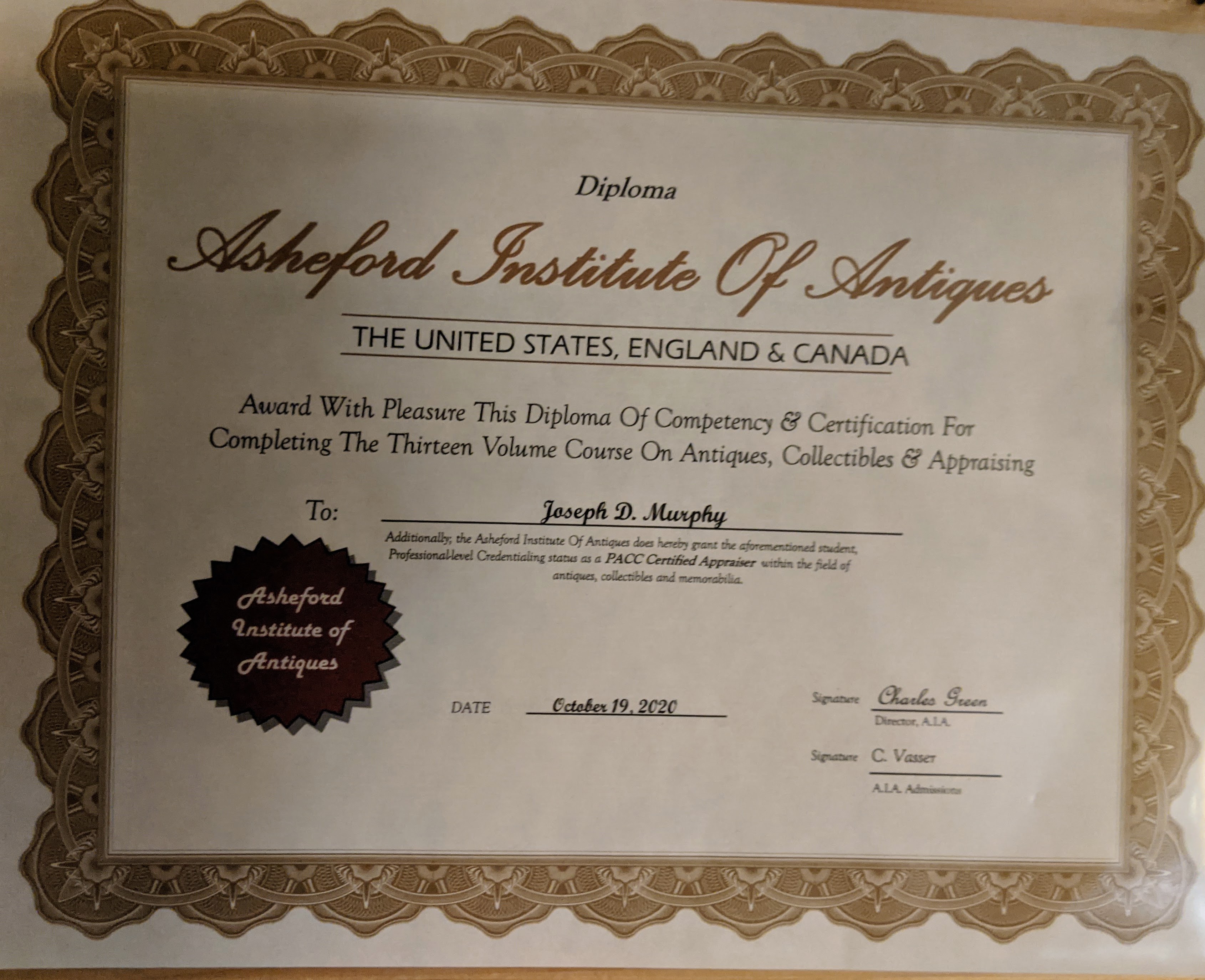 We are certified furniture and antique appraisers . We are PACC members and certified from the Asheford Institute.